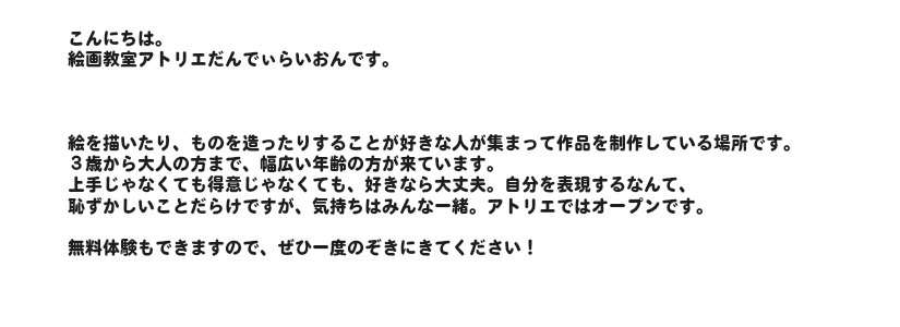 【生徒作品展】 生徒さんが 1年の間に制作した作品を 一挙に公開します。 作品はできるだけ全部を 会場全体に展示しています。 お子様、お友達の 圧倒的な作品のパワーを感じに ぜひ観に来てくださいね! また、 ゲームの屋台やワークショップも 毎年開催しています。 こちらも内容が変わりますので 今年もお楽しみに!! 会場:ギャラリーカフェアルル。  |
