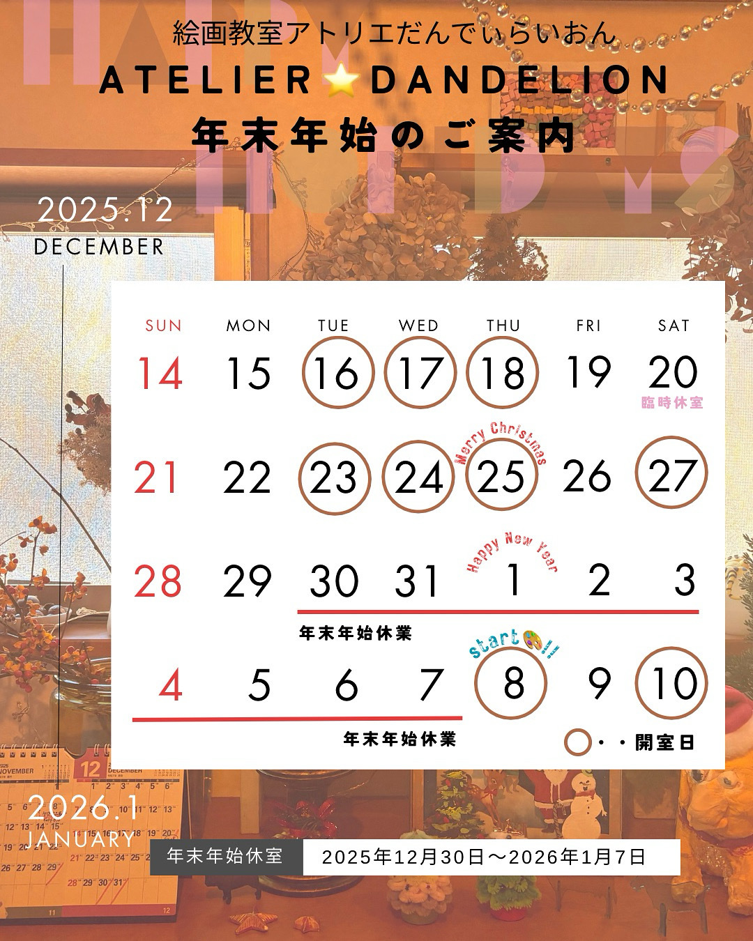 12月30日(火)〜新年1月7日(水)は、年末年始のため休室とさせて頂きます。
